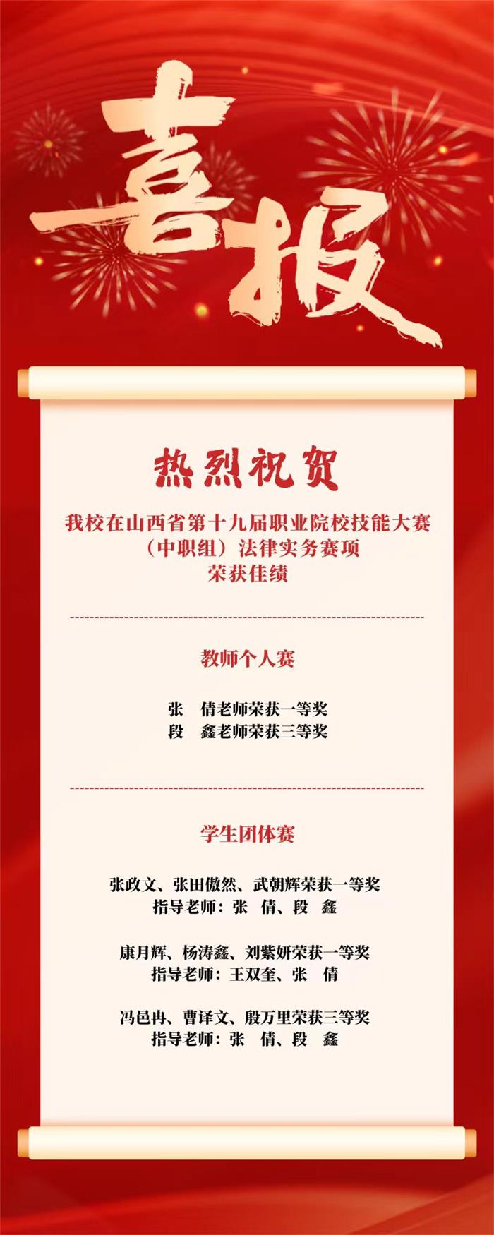 热烈祝贺我校在山西省第十九届职业院校技能大赛(中职组)法律实务赛项荣获佳绩